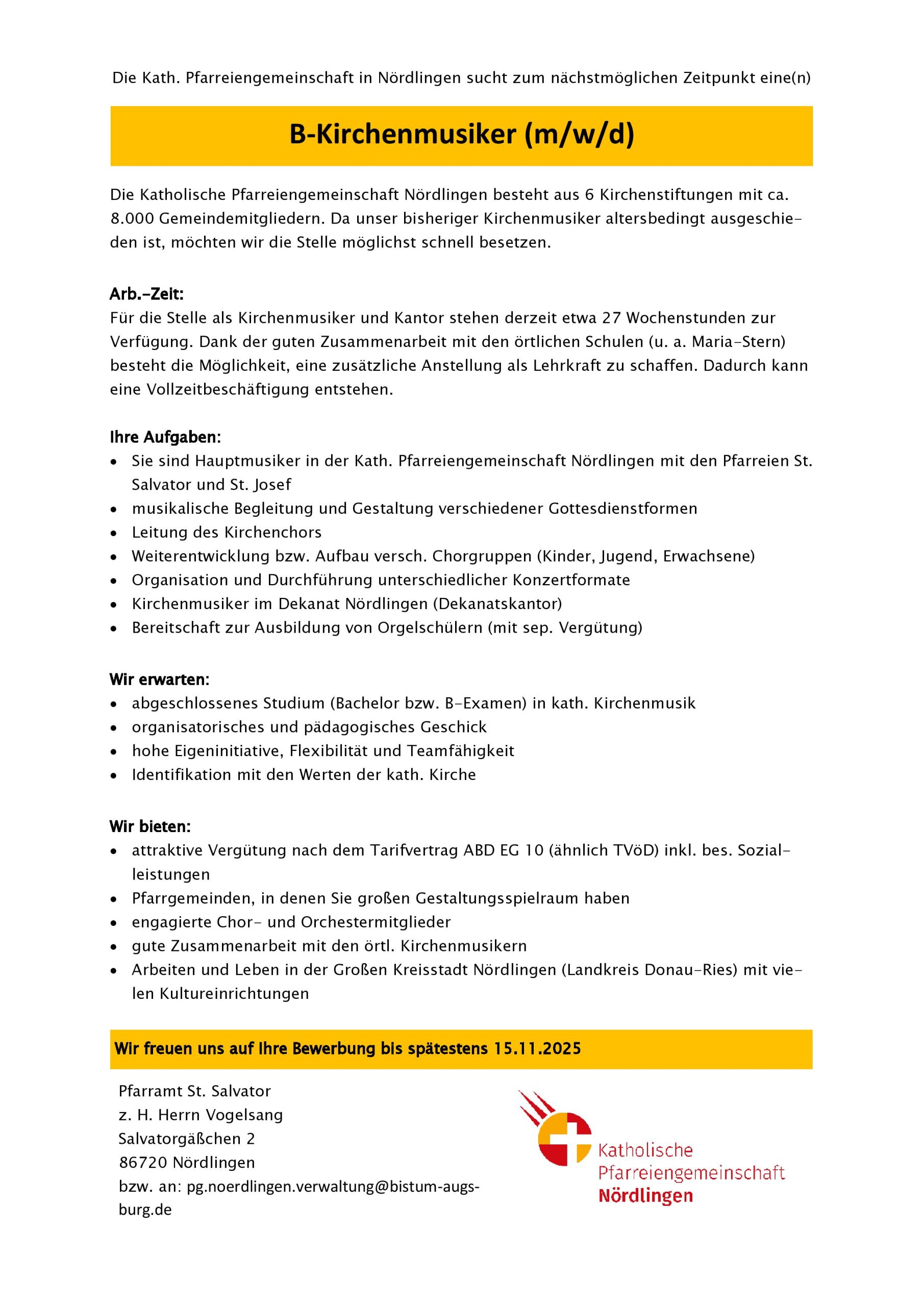 Die Katholische Pfarreiengemeinschaft Nördlingen besteht aus 6 Kirchenstiftungen mit ca. 8.000 Gemeindemitgliedern. Da unser bisheriger Kirchenmusiker altersbedingt ausgeschieden ist, möchten wir die Stelle möglichst schnell besetzen.