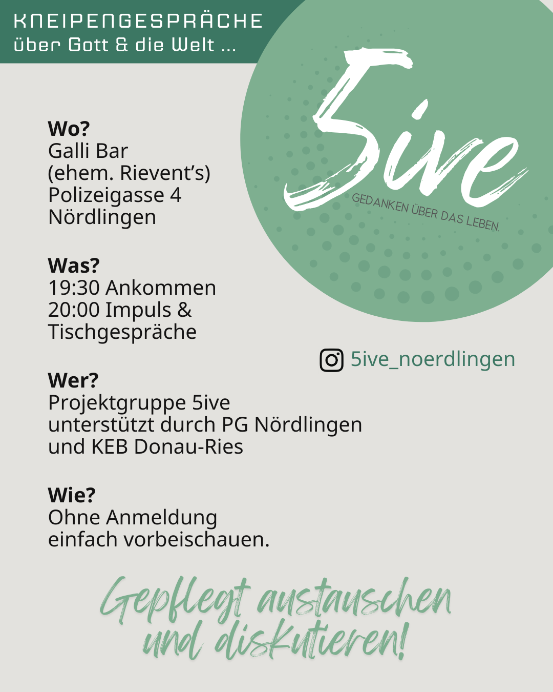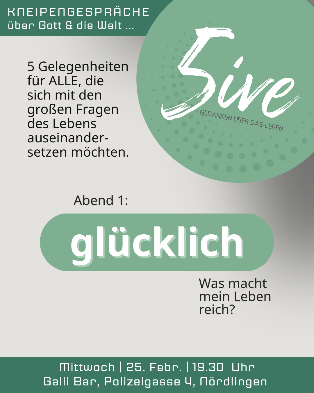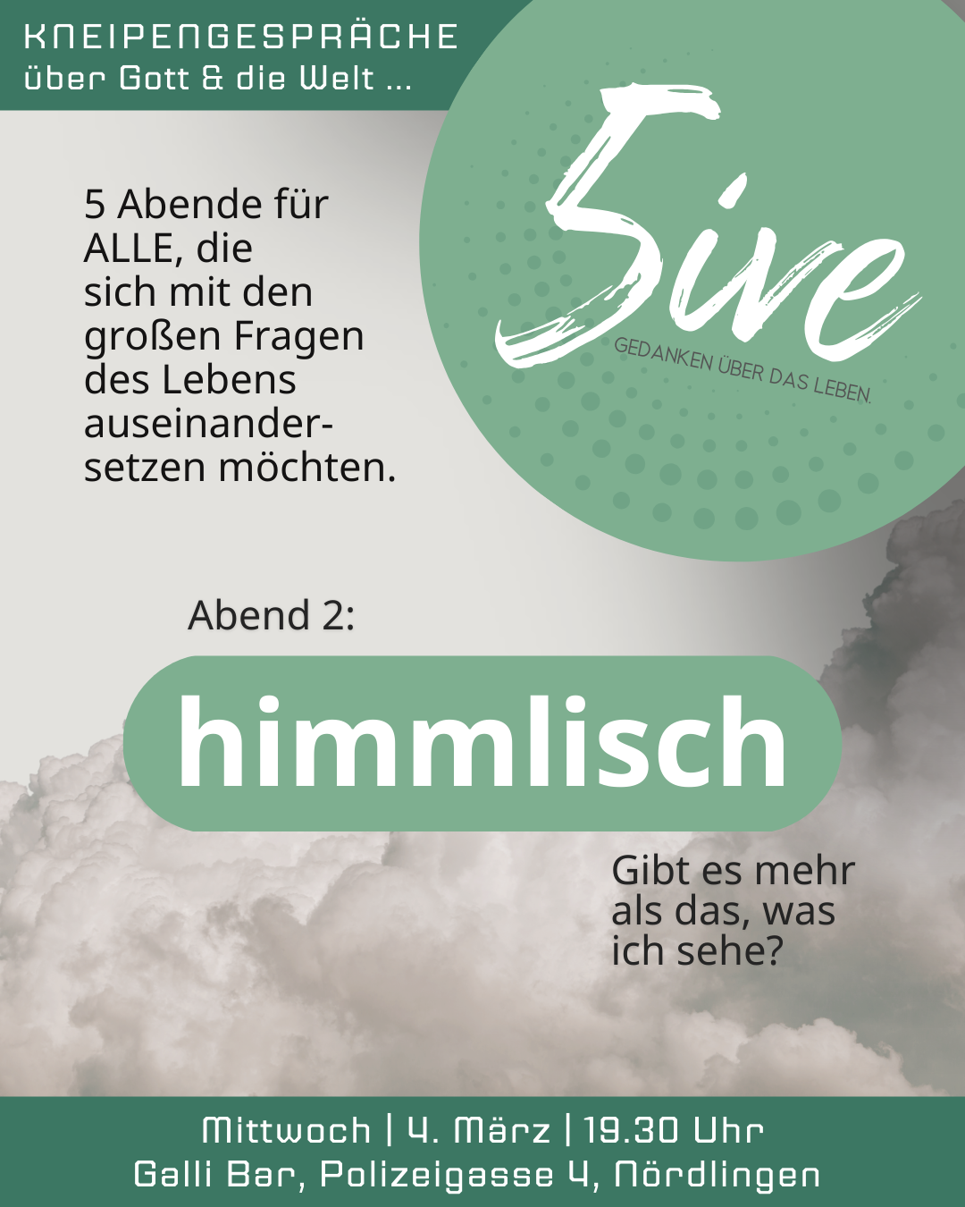 Fünf Gelegenheiten für ALLE, die sich mit den großen Fragen des Lebens auseinandersetzen möchten. Wir treffen uns jeweils um 19:30 Uhr im ehem. Rievent´s in der Polizeigasse 4 in Nördlingen.
